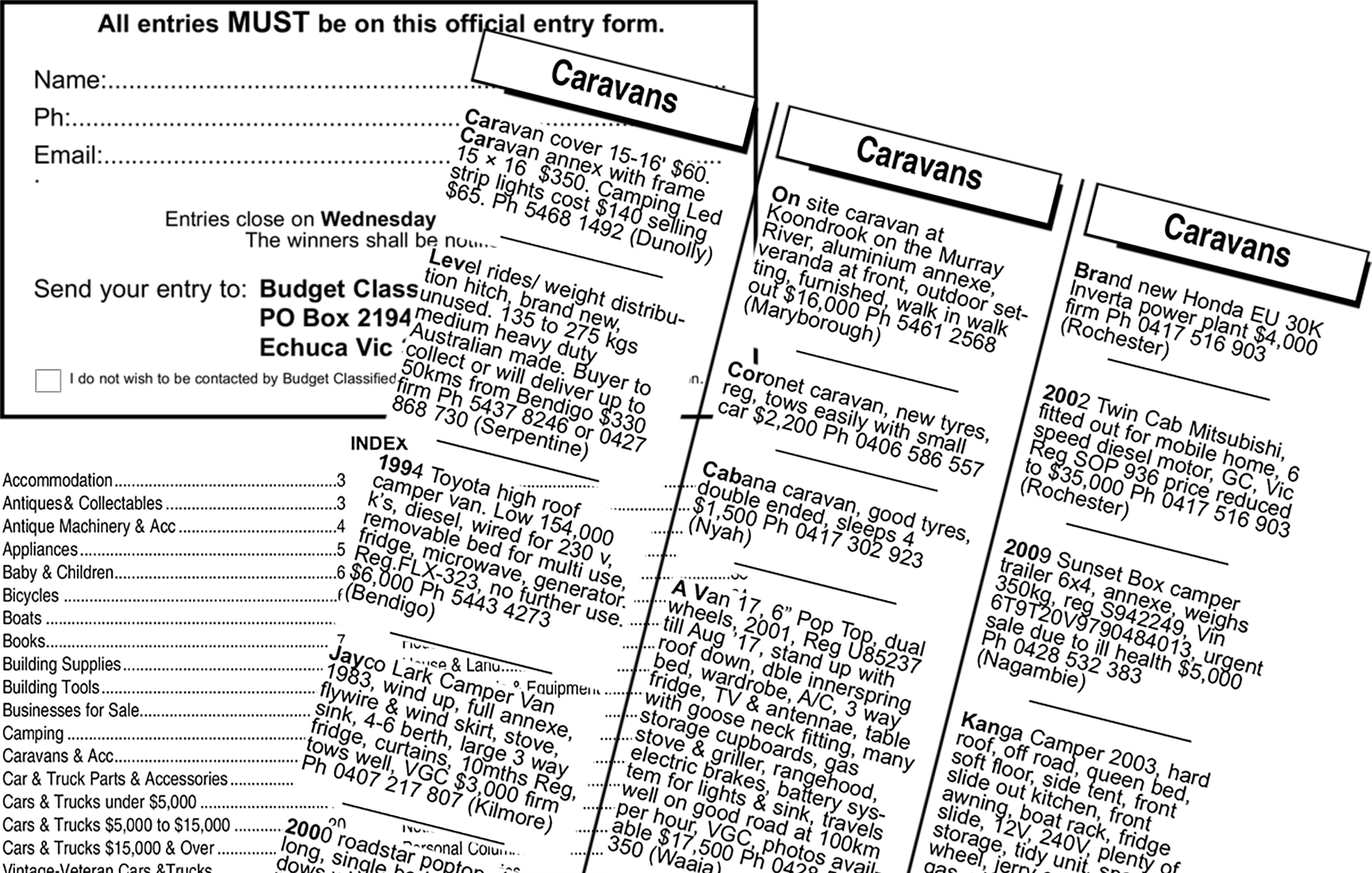 We advise that Budget Classifieds is not involved in the actual transaction between buyers and sellers and for any liability for any loss or damage (actual, special, direct, indirect and consequentialy) of any nature whatsoever, either unsuspected, disclosed, undisclosed arising out of or in anyway connected with any transaction. We further confirm that Budget Classifieds does not provide any warranties as to title merchantability or fitness for a particular purpose and that no agency, partnership, joint venture, employee-employer, franchiser-franchisee or other similar agreement is hereby created AND we agree to indeminity and release Budget Classifieds and hold it and its related entities, affiliates and or employees from all or any liability, actions, suits, proceedings, claims, demands, costs and expenses however realted to or arising out of any transaction entered into as result of using the services of Budget Classifieds whether such liability or claims arise by way of breach of contract, negligence or otherwise.